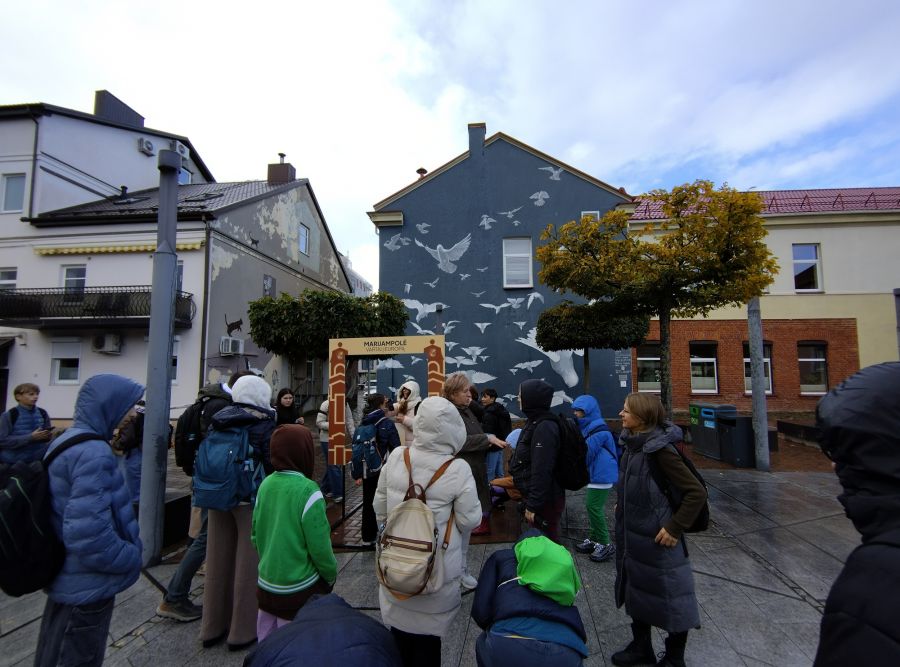 Höhepunkt des Tages war der Besuch des Marijampole Kulturzentrums – ein beeindruckender Bau mit großem Saal und vielen Ausstellungen. Wir durften dort in einem Workshop traditionellen litauischen Scherenschnitt kennenlernen und für uns und unsere Gastgeber*innen Lesezeichen gestalten. Den Abschluss bildete eine ActionBound-Rallye, bei dem wir in vielen kleinen Teams die verschiedenen Wandbilder MaLonNY-Streetart-Projektes und andere Attraktionen in der Stadt genauer betrachteten.
